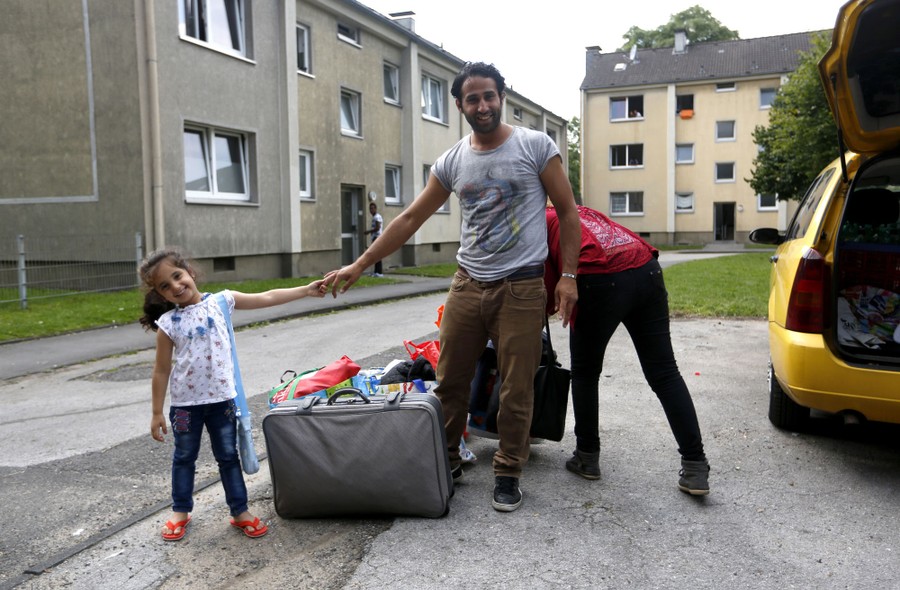 Read moreFour-year old Lilas, a migrant from Syria, and her father pose for a photo in front of their refugee home after receiving articles for daily use prepared by donors at a distribution center in Muelheim an der Ruhr, Germany, on August 20, 2015. #