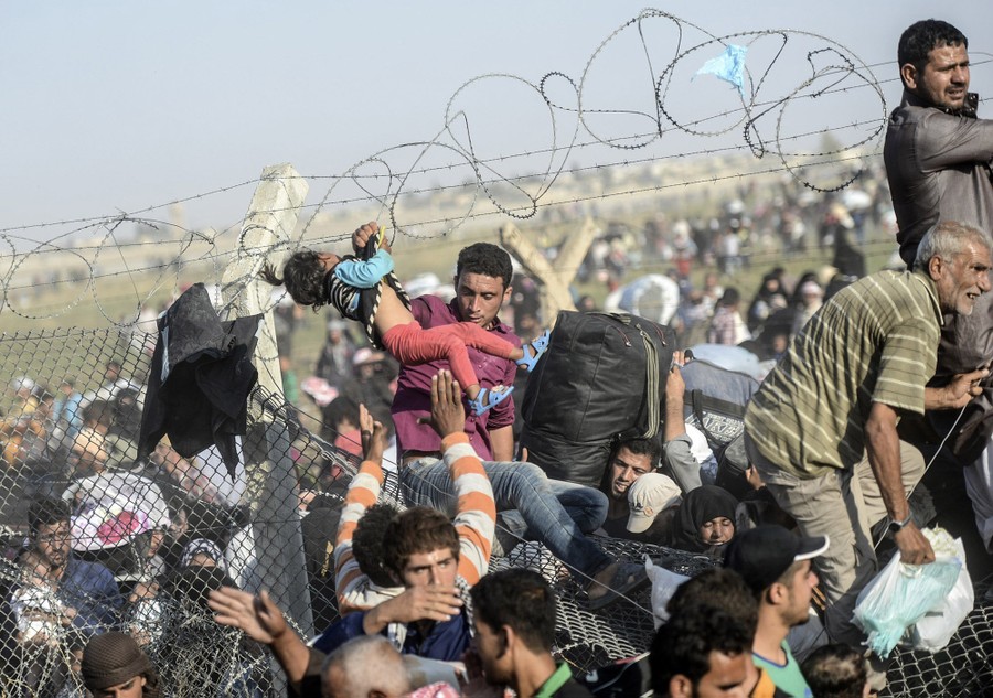 Read moreA man lifts a young girl clear of the wire as Syrians fleeing the war pass through broken-down border fences to enter Turkish territory illegally, near the Turkish Akcakale border crossing in the southeastern Sanliurfa province, on June 14, 2015. #