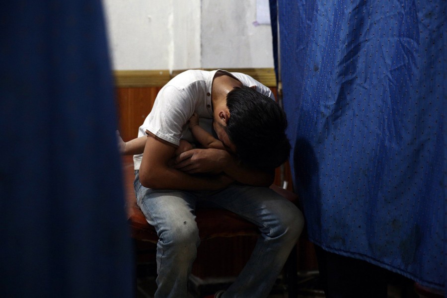 Read moreA man carrying his niece reacts after he lost his sister, the child’s mother, at a makeshift hospital in the rebel-held area of Douma, Syria, following reported air raids by Syrian government forces on August 24, 2015. #