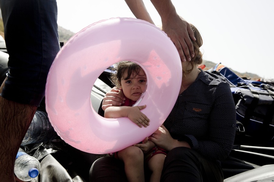 Read moreA man carries a child as migrants and refugees arrive on a raft after crossing from Turkey to the island of Lesbos, Greece, on September 8, 2015. The small island has been transformed by the sudden new population of some 20,000 refugees and migrants, mostly from Syria, Iraq, and Afghanistan. #