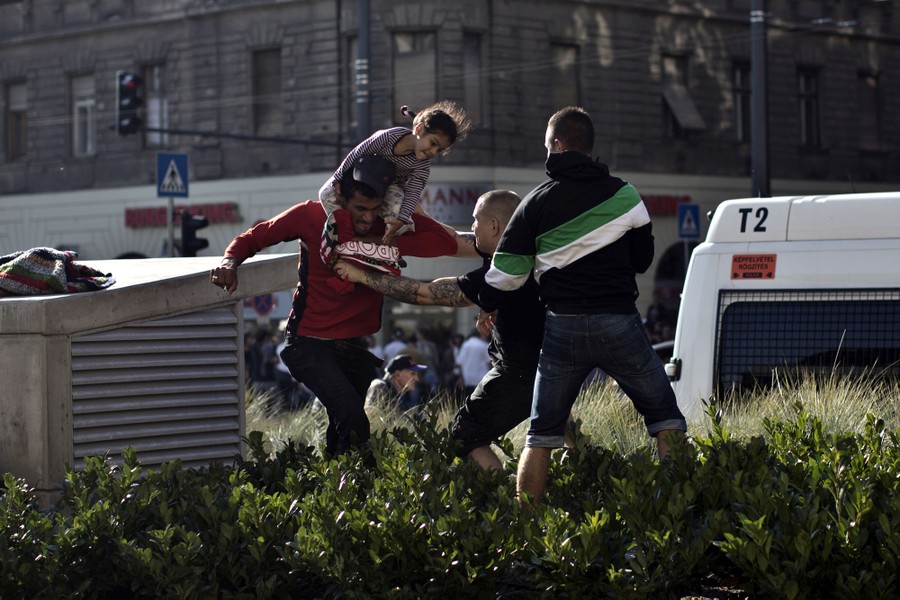 Read moreA Syrian man carrying a child (left) scuffles with a Hungarian nationalist in front of the Keleti train station in Budapest, Hungary, on September 4, 2015. Minor skirmishes broke out Friday at the Keleti train station, where hundreds of migrants and refugees are camped. #
