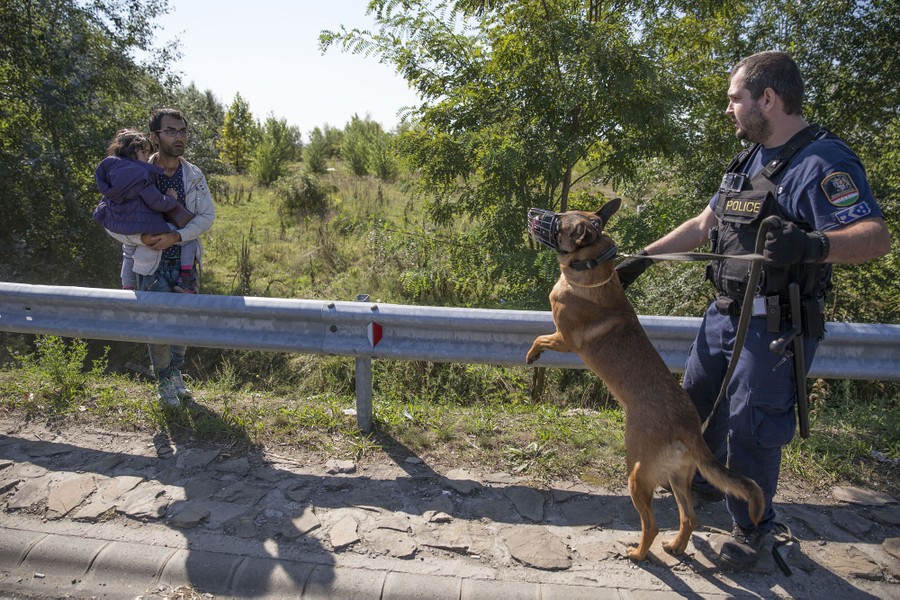 Read moreA man is confronted by a Hungarian police officer with a dog as he holds his daughter while migrants run across a highway in Morahalom, Hungary, on September 9, 2015. Since the beginning of 2015, the number of migrants using the so-called “Balkans route” has exploded, with migrants arriving in Greece from Turkey and then traveling on through Macedonia and Serbia before entering the EU via Hungary. The number of people leaving their homes in war-torn countries such as Syria marks the largest migration of people since World War II. #