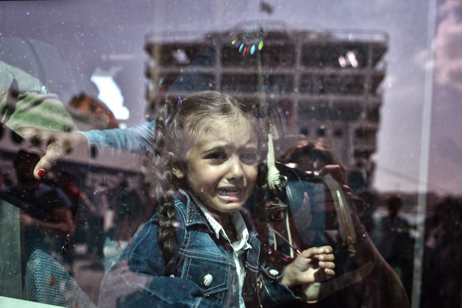 Read moreA refugee child cries as she sits on an overcrowded bus transporting refugees and migrants to the metro and train stations, after they disembarked from a government-chartered ferry (reflected in the window) in the port of Piraeus in the Athens area on September 8, 2015. #