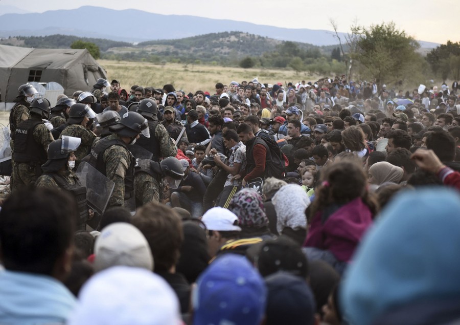 Read moreA Macedonian policeman stands amid migrants and refugees who wait to cross the border of Greece and Macedonia near the town of Idomeni, northern Greece, on September 7, 2015. #