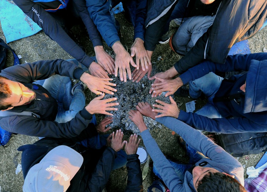 Read moreRefugees warm up their hands over hot ash from a bonfire at a migrant collection point near the village of Roszke on the Hungarian-Serbian border on September 8, 2015. #