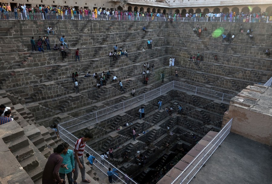 Read moreIndian people gather at the historic Chand Baori stepwell in Abhaneri village of western Rajasthan state on September 24, 2015. For a few hours on one day each year, local residents are permitted to descend into the 100-foot-deep, 1,200-year-old stepwell, as Hindu devotees in the area mark a local festival, at the same time as Hindus worldwide observe Ganesh Chaturthi festivities. Chand Baori is one of the oldest and largest stepwells in the world, with some 3,500 steps laid out in a geometric design down to the water at its base. #