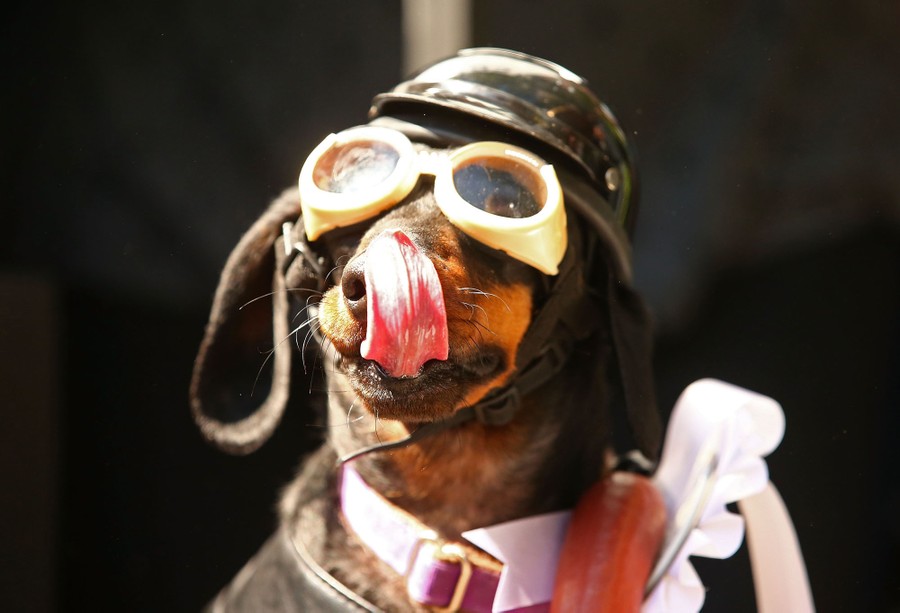 Read moreMini dachshund Chilli, dressed as a biker dog, licks her lips as she competes in the Hophaus Southgate Inaugural Best Dressed Dachshund competition on September 19, 2015, in Melbourne, Australia. #