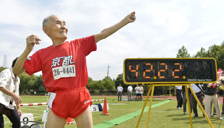 Read more105-year-old Japanese Hidekichi Miyazaki poses like Jamaica's Usain Bolt in front of an electric board showing his 100-meter record time of 42.22 seconds at an athletic field in Kyoto, Japan, on September 23, 2015. Miyazaki set a record as the world's oldest competitive sprinter this week, one day after turning 105, but said he was disappointed at falling short of his own personal best. #