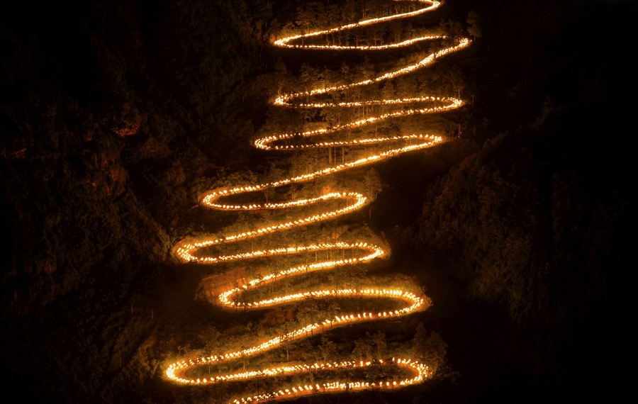 Read morePeople holding torches walk on a mountain trail during a trekking event to mark the 70th anniversary of the end of World War II, in Qinglong County, Guizhou Province, China, on September 4, 2015. Around 2,974 people participated in trekking the trail, along which American aid to China was transported from Myanmar to China’s front lines during World War II, according to local media. #
