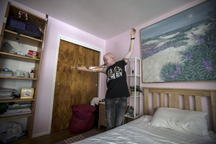 Read moreMwigulu Matonage, 12, (left) and Emmanuel Festo, 13, (right) put on their prosthetic arms as Baraka Cosmas,5, watches in their bedroom in New York on September 21, 2015. #