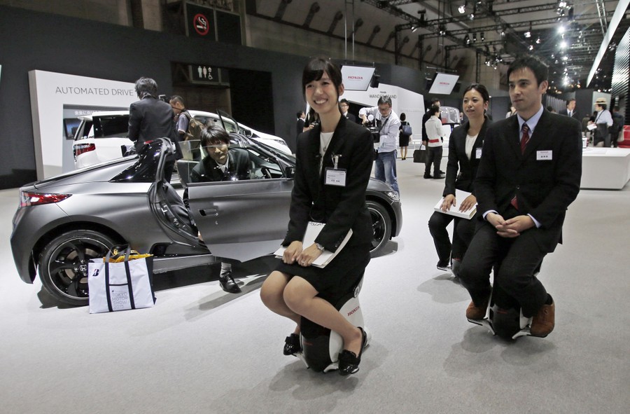 Read moreHonda Motor employees ride on Honda UNI-CUB ß through the Japanese automaker's booth during the media preview of the Tokyo Motor Show in Tokyo on October 28, 2015. #