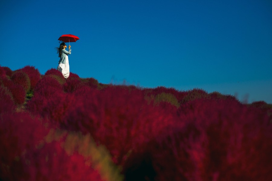 Read moreA woman holds a parasol as she stands in a field of fireweed, or Kochia scoparia, on a sunny autumn day at the Hitachi Seaside Park in Hitachi, north of Tokyo, on October 26, 2015. Fireweed is a grass bush that takes on a bright red color in autumn. #