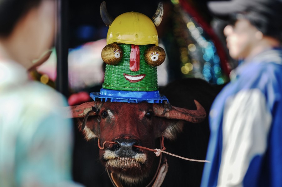 Read moreA buffalo with a decoration on its head, during Buffalo Racing Festival in Chonburi, Thailand, on October 26, 2015. The annual Buffalo Racing Festival of Thailand's Chonburi Province has been a local tradition for over 140 years. Rice farmers engage themselves in races to show appreciation to the hard work of buffaloes, which play a vital role in rice production. #