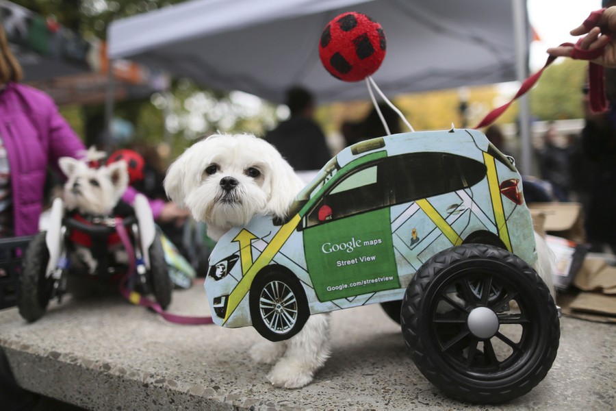 Read moreParalyzed rescue dogs Maury, right, and Little Miss Lexi in Google Maps street view car costumes participate in the annual Tompkins Square Halloween Dog Parade in New York on October 24, 2015. Hundreds of dogs took part in what's billed as the nation's largest Halloween dog parade. #