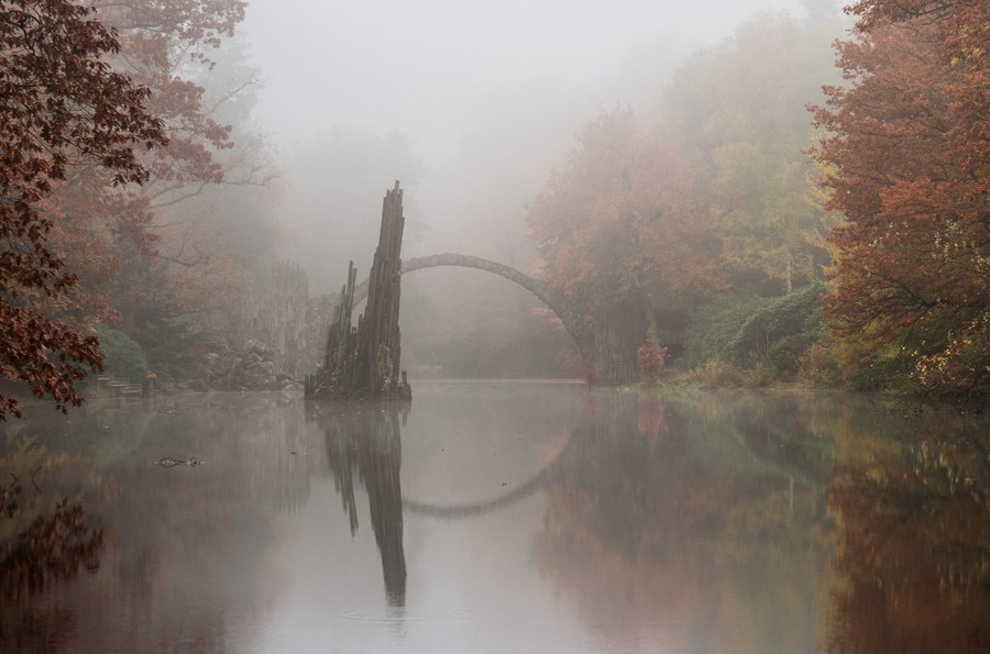 Read moreA view through the morning mist to the Rakotzbrücke in the Rhododendron Park Kromlau (Saxony), Germany, on October 27, 2015. The Rhododendren field facility was established as landscape park in the middle of the 19th century. #