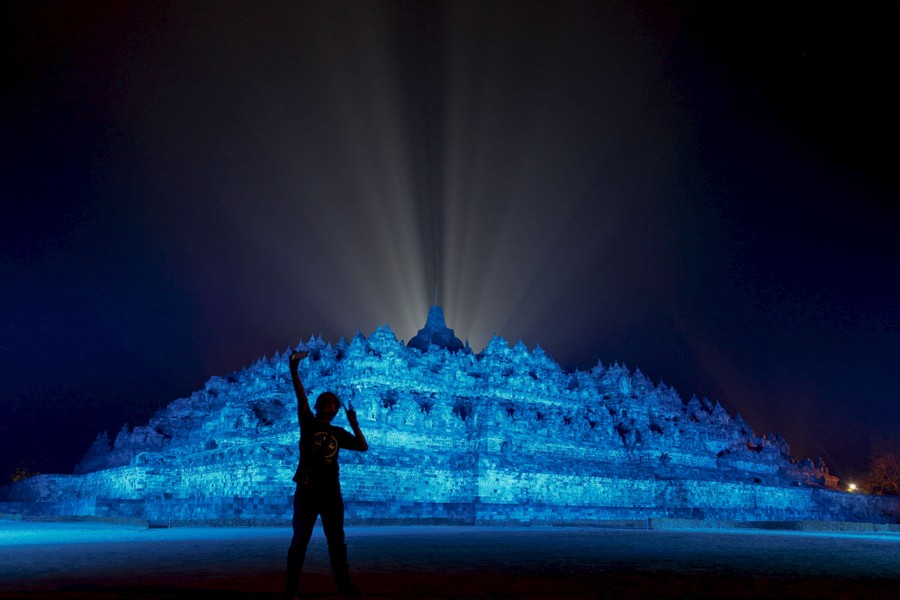Read moreA visitor takes a picture as the ninth century Borobudur temple is illuminated with blue light to honor the 70th anniversary of the United Nations in Magelang, Central Java, Indonesia, on October 24, 2015. Landmarks around the world were lit up in blue to celebrate the event. #