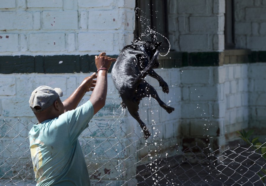 Read moreA man wading through receding floodwaters pauses to pick up a swimming dog and toss it over a fence onto a raised patio, two days after the passage of Hurricane Patricia, in the village of El Rebalse, Jalisco State, Mexico, on October 25, 2015. The dog landed safely, but quickly ran around the fence and jumped back into the water to continue swimming. #