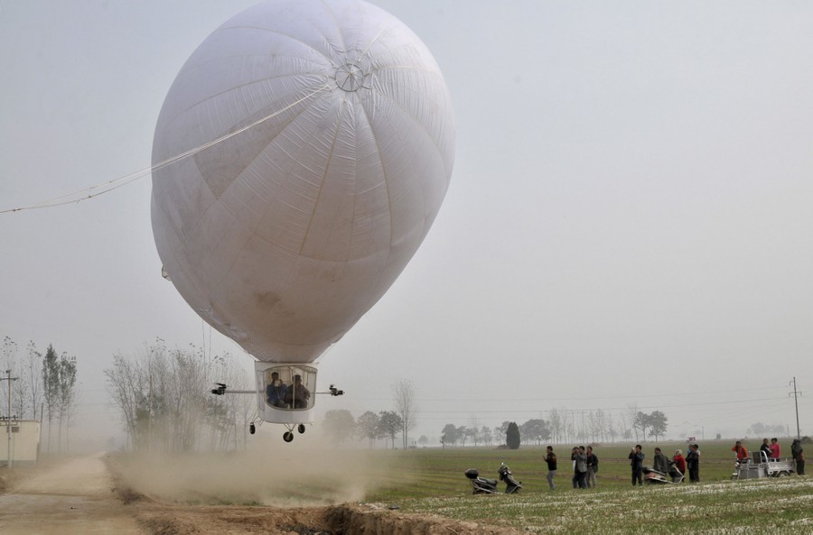 Read moreA homemade airship, built by 29-year-old local man Shi Songbo, lifts off during a test flight next to crop fields in Ningling County of Shangqiu, Henan Province, China, on October 23, 2015. The 10-meter-long, 23-meter-high, two-seated air ship, which cost Shi 300,000 yuan ($47,187 USD) and four months time to make, performed eight successful trial flights on Friday, local media reported. #