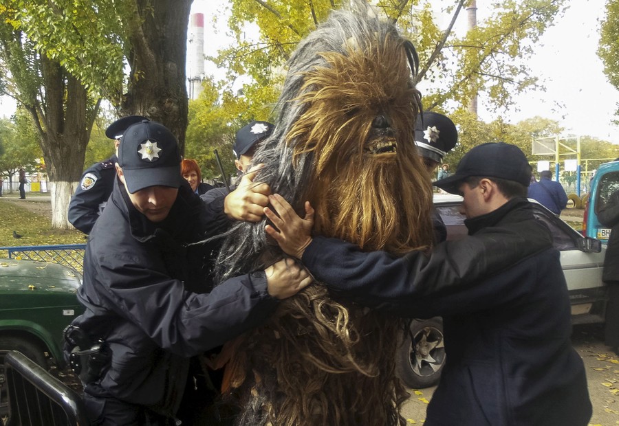 Read moreChewbacca under arrest in Ukraine. Policemen detain a person dressed as Star Wars character Chewbacca during a regional election near a polling station in Odessa, Ukraine, on October 25, 2015. The wookiee was detained for illegal election-day campaigning, according to local media. #