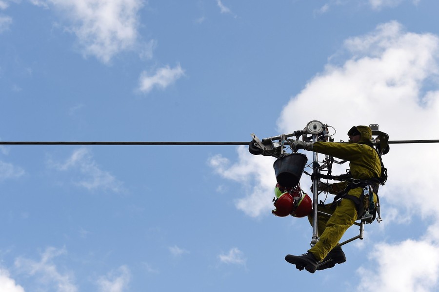 Read moreAn electrician of RTE, the electricity transmission system operator of France, works on a high-tension line of 225,000 volts on October 9, 2015, in Eygalieres, southern France. #