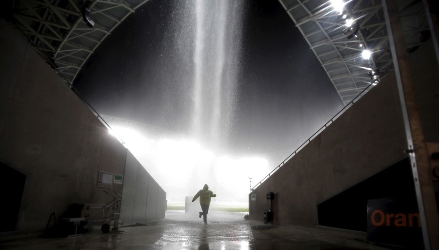 Read moreA man runs to protect himself from heavy rain as the France Ligue 1 soccer match between Nice and Nantes is stopped at Allianz Riviera stadium in Nice, France, on October 3, 2015. #