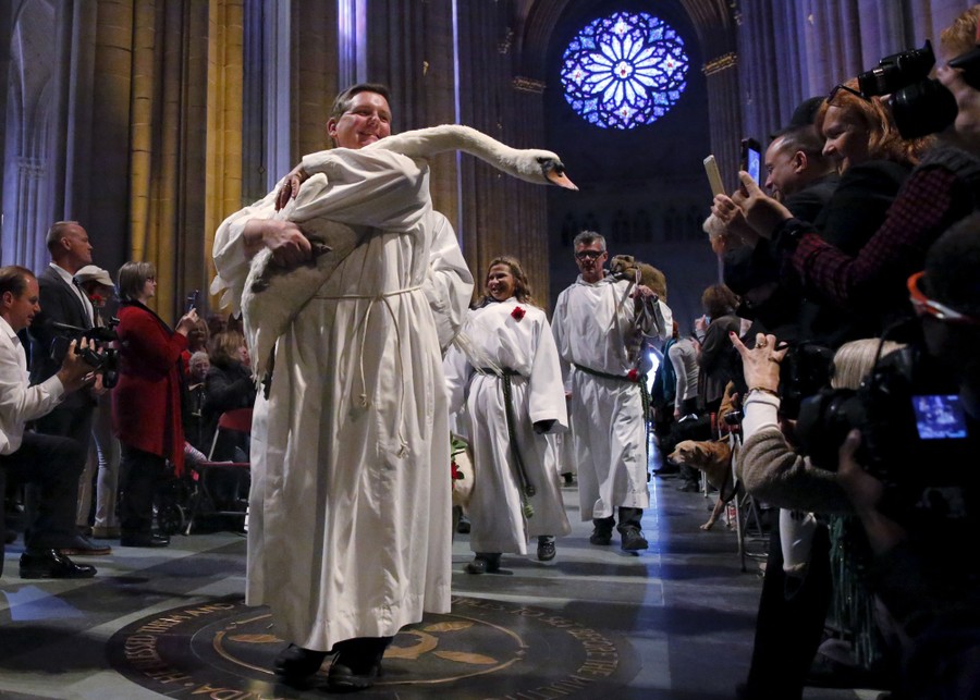 Read moreA swan is carried down the nave of the cathedral during the Procession of the Animals at the 31st annual Feast of Saint Francis and Blessing of the Animals at the Cathedral of St. John the Divine in Manhattan on October 4, 2015. #