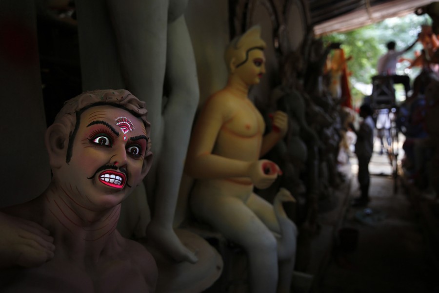 Read moreAn idol of a demon king stands in the foreground as artists work on idols of the Hindu goddess Durga in preparation for the upcoming Durga Puja festival in New Delhi, India, on October 7, 2015. The festival, to be celebrated from October 19 to 22, commemorates the slaying of a demon king by the lion-riding, 10-armed goddess Durga, marking the triumph of good over evil. #