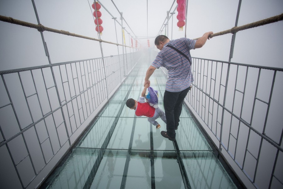 Read moreA Chinese tourist holds onto his son as they walk across a glass-floored suspension bridge in the Shinuizhai mountains in Pingjang County, Hunan Province, China, on October 7, 2015. The bridge, originally a wooden walkway spanning some 300 meters across the 180-meter-deep valley, reopened two weeks ago following renovations as a glass-bottomed tourist attraction. #