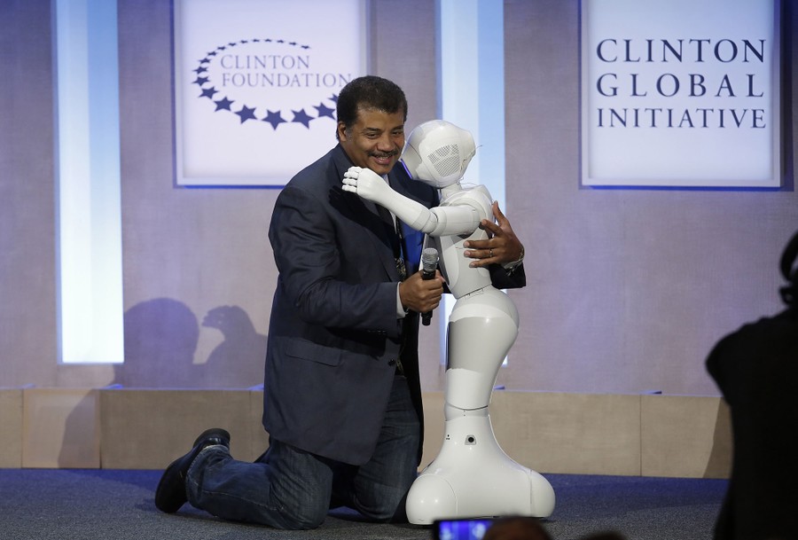 Read moreNeil deGrasse Tyson, an American Museum of Natural History astrophysicist, and Pepper, an Aldebaran and SoftBank social humanoid robot, hug as they speak during the Clinton Global Initiative annual meeting on September 28, 2015, in New York. #