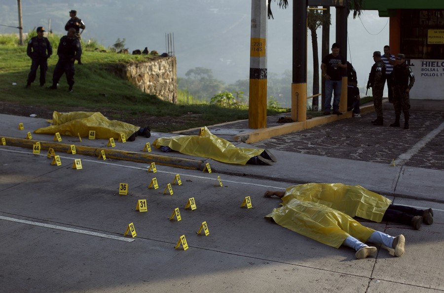Read morePolicemen stand next to the bodies of four slain men at a crime scene in Tegucigalpa, Honduras, on September 30, 2015. Unknown assailants stopped a vehicle and gunned down its four passengers—a father, his two sons, and a nephew—early Wednesday, local media reported. #