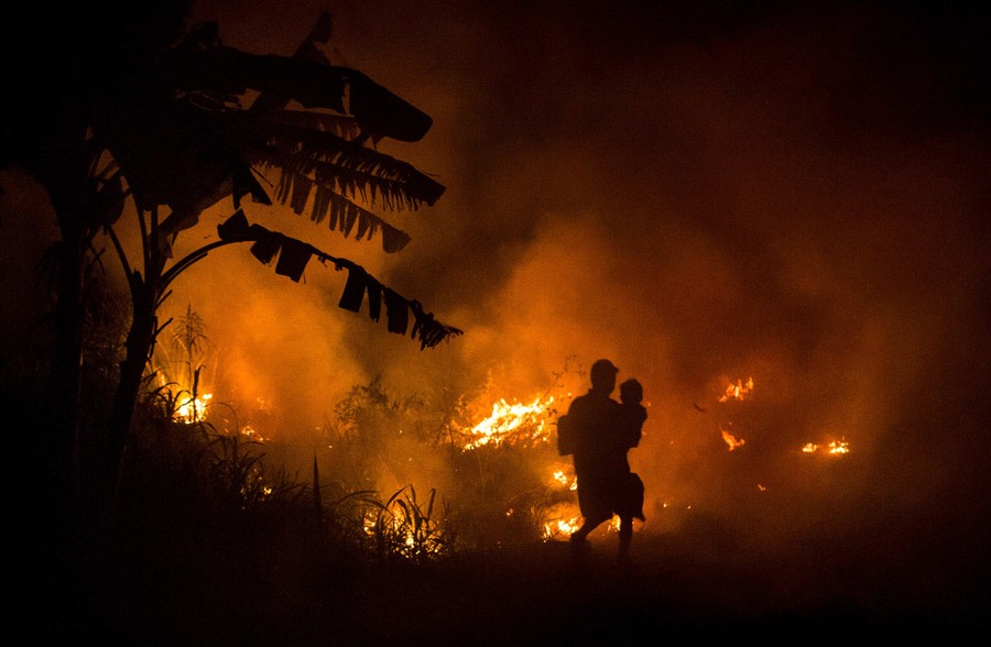 Read moreA man carries his son through haze on the way to his house as a fire burns peatland and fields in the Ogan Ilir regency on October 2, 2015, in Palembang, South Sumatra, Indonesia. The air pollution or haze has been an annual problem for the past 18 years in Indonesia. It's caused by the illegal burning of forest and peat fires on the islands of Sumatra and Borneo to clear new land for the production of pulp, paper, and palm oil. Singapore and Malaysia have offered to help the Indonesian government fight against the fires, as infants and their mothers are evacuated to escape the record pollution levels. #