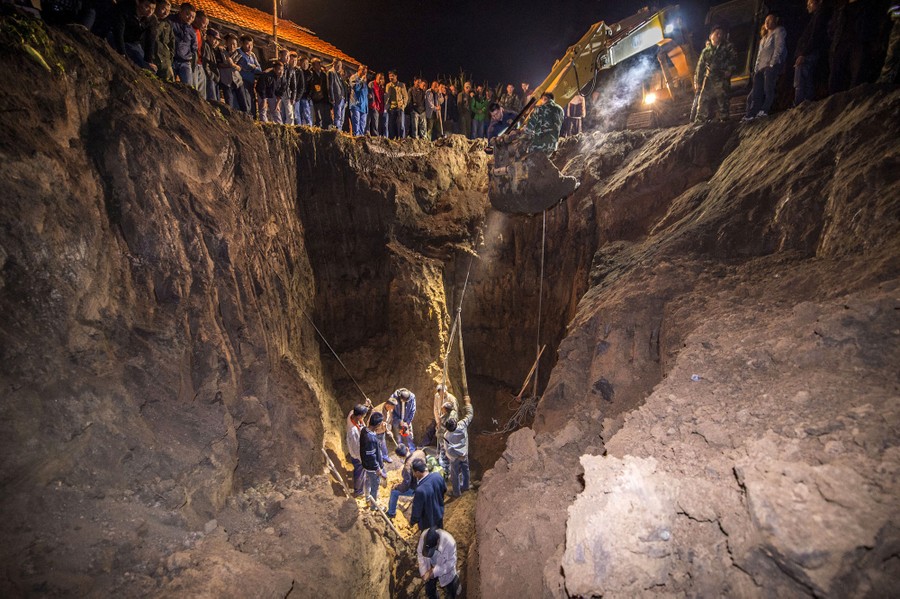 Read morePeople watch rescuers try to pull 50-year-old Zhao Hongxia out of a well in Xinhu township of Changchun, Jilin Province, China, on September 24, 2015. Zhao, who suffered from mental illness, was killed after she fell into the well, becoming stuck at a depth of 13 meters for over five hours. The well was very narrow, so rescuers had to excavate a wider opening and dismantle the well piece by piece to reach her, local media reported. #