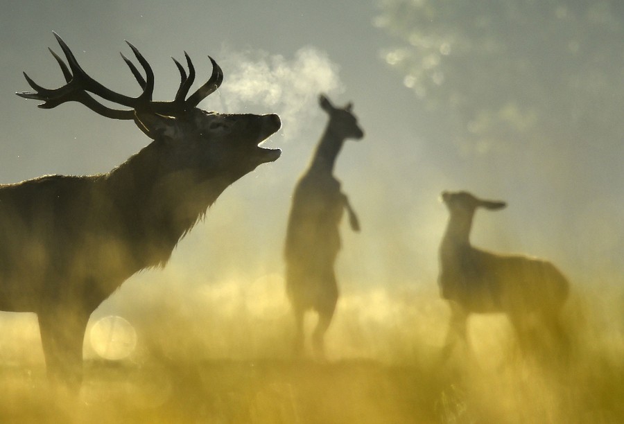 Read moreA red deer stag, with females seen behind, barks in the morning sun in Richmond Park in west London, England, on October 2, 2015. The Royal Park has had red and fallow deer present since 1529, and early autumn sees the rutting or breeding season begin among the herd of over 600 animals. #