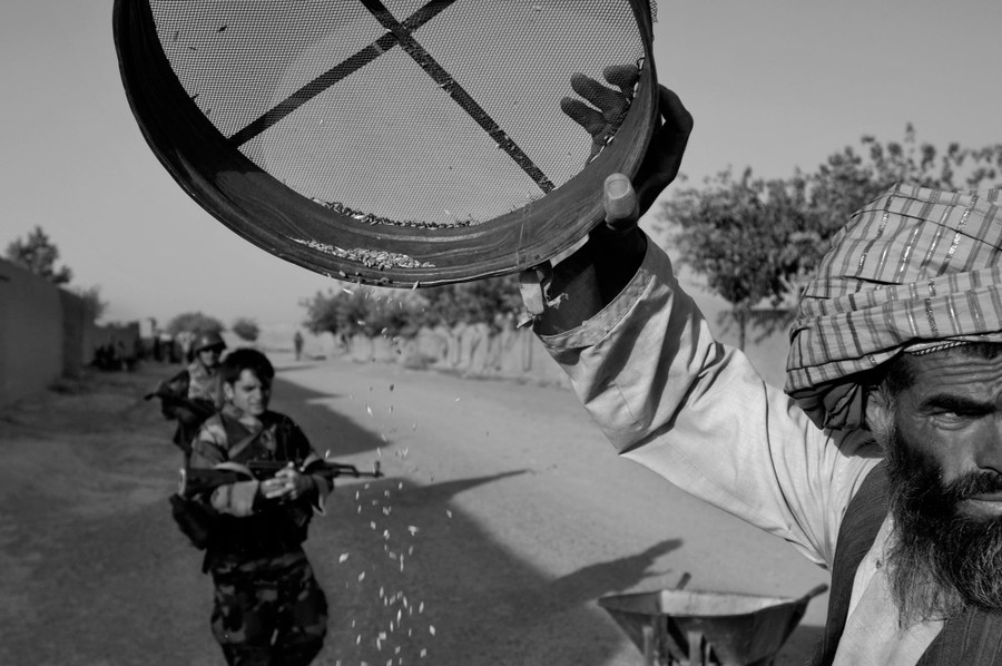 Read moreAn Afghan farmer processes his wheat crop outside while a group of Afghan soldiers conduct searches of homes after a battle with insurgents in the Howz-e-Madad Bazaar in Zhari District. #