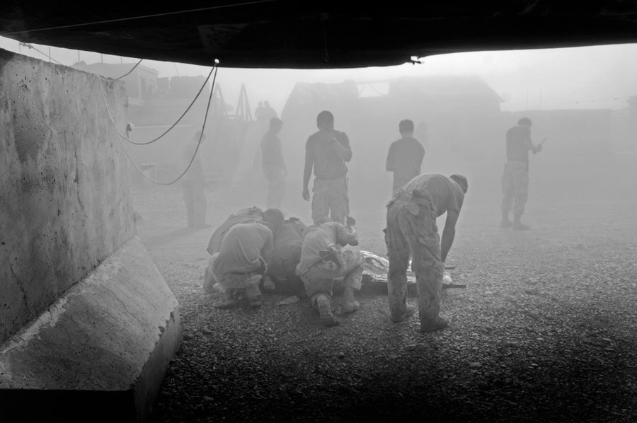 Read moreCanadian soldiers shelter a casualty outside a field hospital from a helicopter’s dust before moving him to a medevac for transport to Kandahar Airfield in Zhari District, Kandahar Province. #