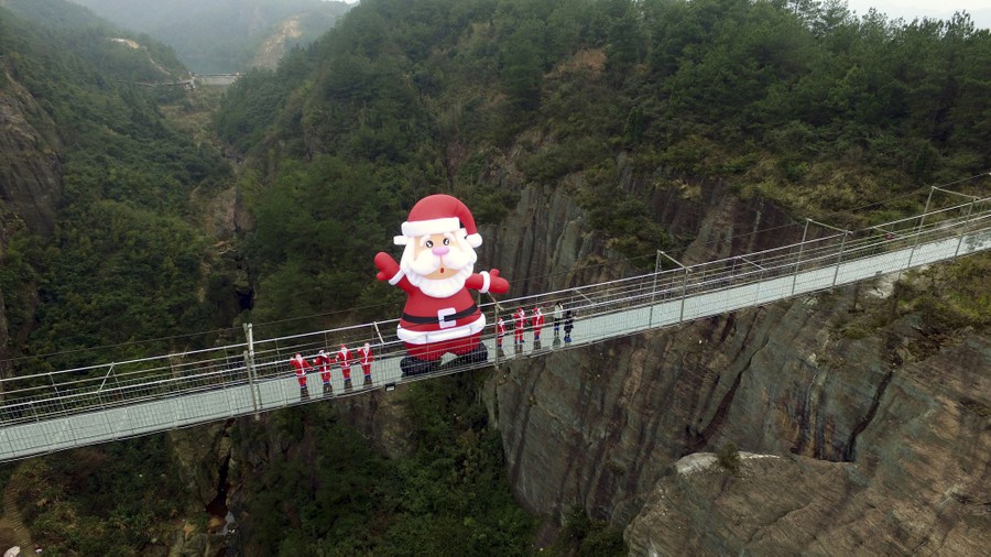 Read moreA giant inflatable Santa Claus is set up on a glass bridge during a promotional event to celebrate the upcoming Christmas, at Shiniuzhai tourist resort in Yueyang, Hunan province, China, on December 23, 2015. #