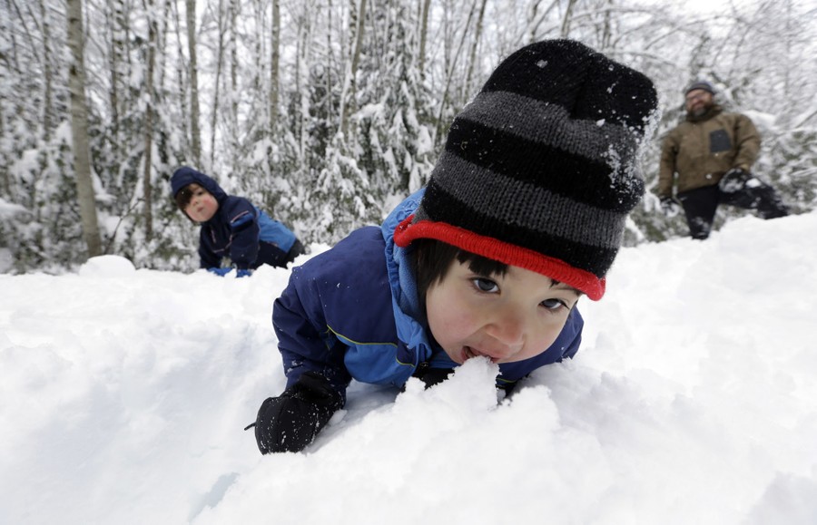 Read moreLeon Perkins, 3, leans forward to take a bite of snow as he plays with his brother Conner, left, 2, and his father Erin, Tuesday, December 22, 2015, at Snoqualmie Pass, Washington. The Seattle family headed to the mountains Tuesday to enjoy the new snow that fell overnight. #