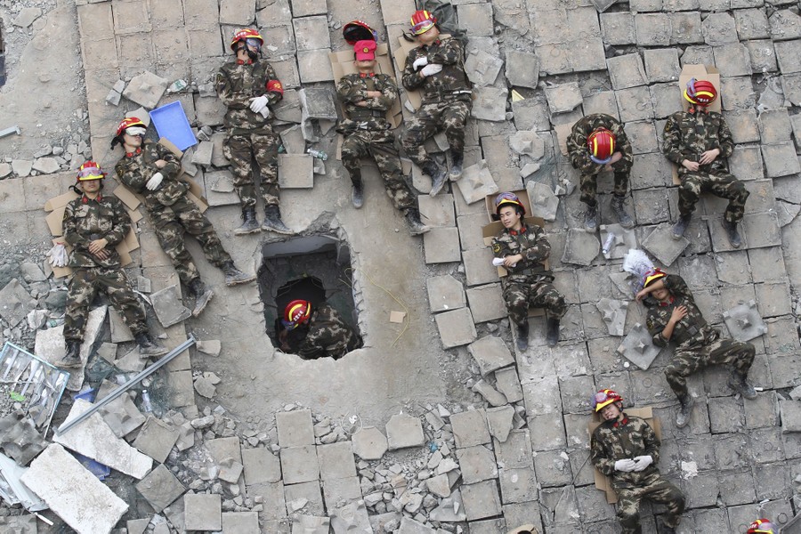 Read moreRescuers sleep among the debris of collapsed buildings during a break of rescue operations after a landslide hit an industrial park on Sunday, in Shenzhen, Guangdong province, China, on December 23, 2015. #
