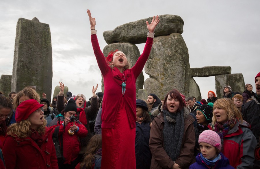 Read moreSusie Ro Prater leads the Shakti Sings choir as druids, pagans and revelers gather in the center of Stonehenge, hoping to see the sun rise, as they take part in a winter solstice ceremony at the ancient neolithic monument of Stonehenge near Amesbury on December 22, 2015, in Wiltshire, England. Despite a forecast for rain, a large crowd gathered at the famous historic stone circle - a UNESCO listed ancient monument - to celebrate the sunrise closest to the Winter Solstice, the shortest day of the year - an event is claimed to be more important in the pagan calendar than the summer solstice, because it marks the 're-birth' of the Sun for the New Year. #