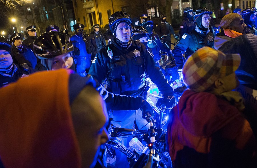 Read morePolice block off a street as demonstrators, calling for the resignation of Chicago Mayor Rahm Emanuel, march near downtown on December 18, 2015, in Chicago, Illinois. A recently released video showing the shooting of teenager Laquan McDonald by Chicago Police officer Jason Van Dyke has sparked almost daily protests in the city. Demonstrators have accused Emanuel of trying to cover up the circumstances surrounding the shooting. #