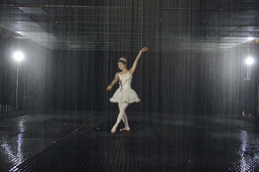 Read moreA girl dances in a rain room on December 18, 2015, in Changsha, Hunan Province, China. 3D trackers installed in the rain room monitor the dancer's motions, sending the coordinates to a control system which regulates the rain, keeping dancers dry. #
