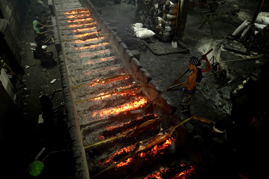 Read moreWorkers rotate bamboo skewered pigs as they are roasted over hot coals in Manila on December 23, 2015. "Lechon", or roasted pig, has always been regular fare at Philippine festivities, especially during Christmas and New Year celebrations. The Philippine Christmas season runs from December until the second week of January. #