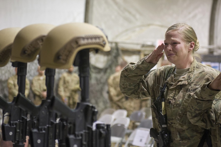 Read moreA U.S. service member salutes her fallen comrades during a memorial ceremony for six Airmen killed in a suicide attack, at Bagram Air Field, Afghanistan, on December 23, 2015. The deadliest attack in Afghanistan since 2013 killed six U.S. troops on Monday, including a family man from Long Island, New York; a South Texan; a New York City police detective; a Georgia high school and college athlete; an expectant father from Philadelphia; and a major from suburban Minneapolis with ties to the military's LGBT community. They were killed when their patrol was attacked by a suicide bomber on a motorcycle near Bagram Air Base, the Defense Department said. #