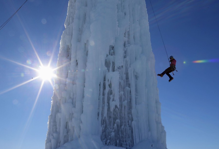 Read moreAn ice climber swings from a rope while descending from a silo covered in ice in Cedar Falls, Iowa, on January 17, 2016. The owners have connected hoses to the top of the silo and spray it with water in winter months to freeze the exterior for climbing. #