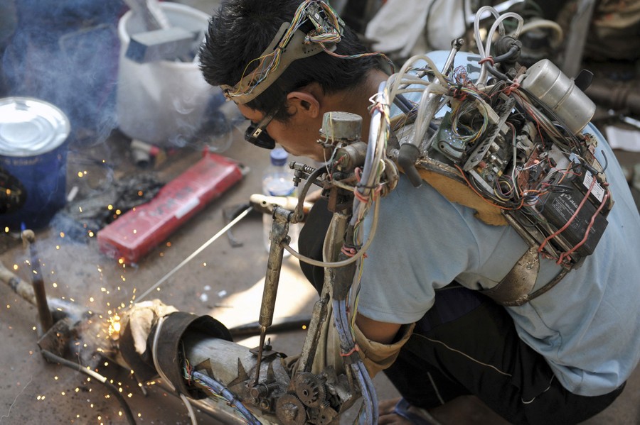 Read moreMechanic I Wayan Sumardana, also known as Tawan, uses what he calls a “robotic” arm he said he made himself, while welding a client's motorbike part at his garage in the village of Nyuh Tebel in Bali, Indonesia, on January 21, 2015. Tawan claimed that he built the device using mostly recycled materials to help him move his left arm after suffering paralysis six months ago. #