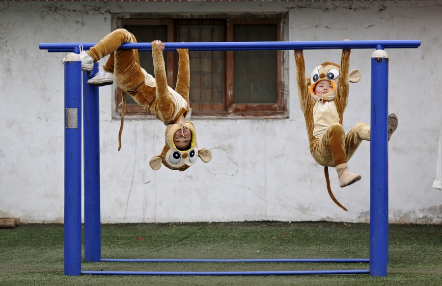 Read moreChildren wearing monkey costumes play before a performance of “Shehuo” festival, ahead of Chinese Lunar New Year, in Hancheng, Shaanxi Province, China, on January 16, 2016. #