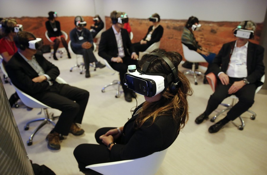 Read moreParticipants attend the ‘Collisions. A Virtual Reality World Premiere’ event at the annual meeting of the World Economic Forum (WEF) in Davos, Switzerland, on January 21, 2016. #