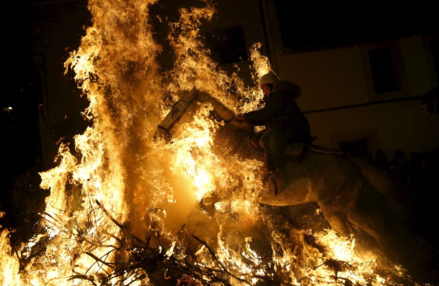 Read moreA woman rides a horse through the flames during the “Luminarias” annual religious celebration on the eve of Saint Anthony's day, Spain's patron saint of animals, in the village of San Bartolome de Pinares, Spain, on January 16, 2016. According to tradition that dates back 500 years, people ride their horses through the narrow cobblestone streets of this small village to purify the animals with the smoke of the bonfires. #