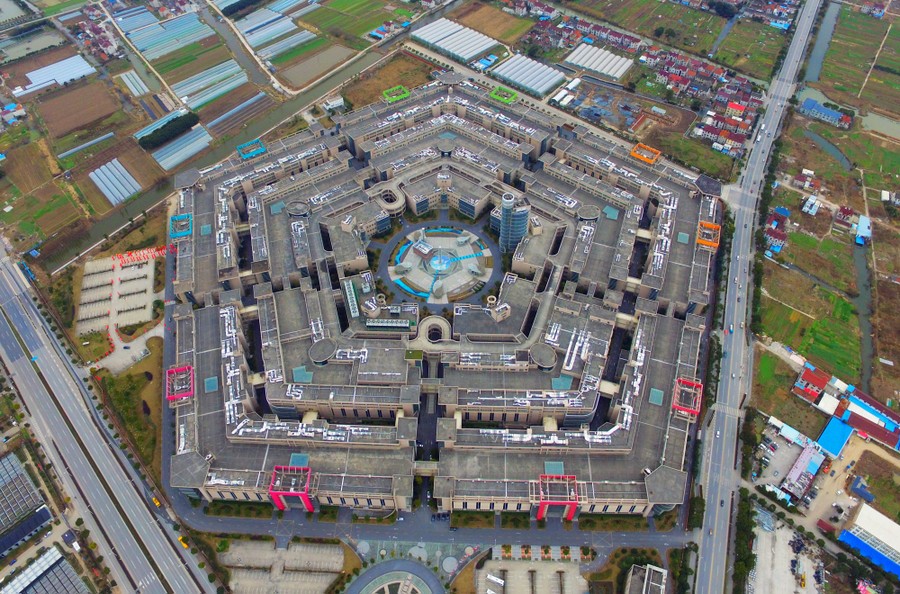 Read moreAn aerial view of Shanghai Pentagonal Mart in Huinan Town of Pudong District on January 20, 2016, in Shanghai, China. A pentagonal market in Shanghai, a complex resembling the Pentagon in the US, has become the largest vacant building in Shanghai. Completed in 2009 with a total area of about 500,000 square meters, the Shanghai Pentagonal Mart has been left vacant mainly because of its location and confusing inner structures. #