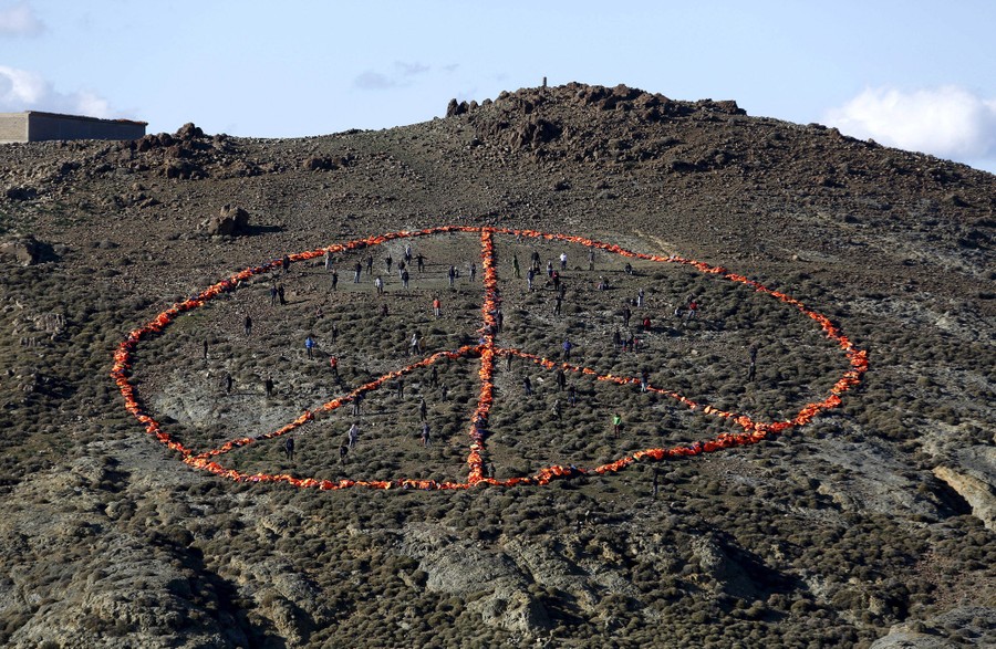 Read moreVolunteers from various non-governmental organizations arrange more than 2,500 discarded lifejackets, used by refugees and migrants, in the shape of the peace symbol on the Greek island of Lesbos, on January 1, 2016. #
